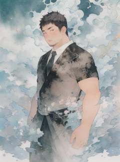best quality,masterpiece,ultra high res, umino,Takato Yamamoto style,1boy,looking at viewer,yosshi film,stubble,gradient_background,bearstyle,(minimalism),zen,chinese painting,cloud,<lora:fatbear_v05:1:lbw=Gobuhime>,style,bearstyle,<lora:海野浩漠Umino_Hiromaku:0.7>,suit and tie,
