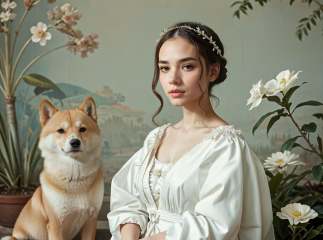 masterpiece,best quality,1girl,solo,portrait,sit,(looking at viewer),renaissance,flower,white dress,plant,simple background,<lora:tiger_v01_02:0.8>,animalstyle,(a woman and a shiba dog),