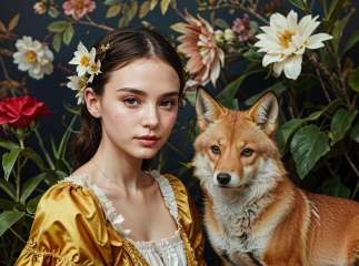masterpiece,best quality,1girl,solo,portrait,sit,(looking at viewer),renaissance,flower,plant,simple background,<lora:tiger_v01_02:0.8>,animalstyle,a woman and a fox,