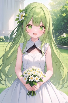 1girl, solo, long hair, looking at viewer, blush, smile, open mouth, bangs, hair ornament, dress, holding, bare shoulders, very long hair, green eyes, standing, flower, :d, small breasts, green hair, sleeveless, indoors, hair flower, white dress, bare arms, sleeveless dress, plant, white flower, bouquet, holding flower, holding bouquet