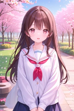 1girl, solo, long hair, looking at viewer, blush, open mouth, bangs, skirt, brown hair, shirt, long sleeves, brown eyes, school uniform, standing, upper body, flower, outdoors, parted lips, sky, serafuku, day, hand up, sailor collar, tree, blue sky, neckerchief, sleeves past wrists, petals, cardigan, blue sailor collar, cherry blossoms, red neckerchief, white cardigan