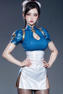 Masterpiece,(UHD) 16K,(Best:1.1),Beautiful face,High detail skin,Super detail,Ultra high resolution,High resolution,Perfect face,Detailed lighting,Detailed skin,Detailed shadows,Larry's skin,Glossy skin,Best,Single person,Upper body lens,Natural light,Medium chest/cleavage,Perfect analysis,3D,pantyhose,chun-li,china_dress,chinese_clothes,dress,pelvic_curtain,spikes,boots,bracelet,spiked_bracelet,jewelry,1girl,white_footwear,bun_cover,cross-laced_footwear,puffy_short_sleeves,puffy_sleeves,hand_on_hip,blue_dress,sash,earrings,short_sleeves,solo,brown_legwear,hands_on_hips,double_bun,breasts,knee_boots,brown_eyes,