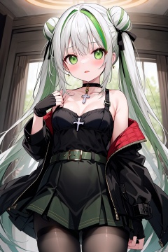 1girl, solo, long hair, breasts, looking at viewer, blush, open mouth, bangs, skirt, shirt, gloves, long sleeves, dress, bow, twintails, jewelry, very long hair, green eyes, jacket, white hair, pantyhose, multicolored hair, cowboy shot, green hair, open clothes, choker, black gloves, belt, indoors, fingerless gloves, off shoulder, hair bun, open jacket, streaked hair, black jacket, black pantyhose, double bun, black bow, gradient hair, black choker, cross, fishnets, fishnet pantyhose, masterpiece