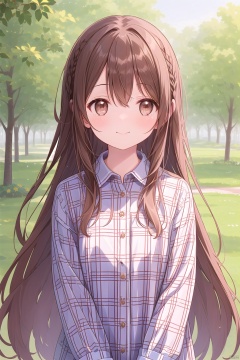 1girl, solo, long hair, looking at viewer, blush, smile, bangs, brown hair, shirt, long sleeves, hair between eyes, brown eyes, very long hair, closed mouth, upper body, braid, outdoors, day, collared shirt, looking to the side, plaid, plant, plaid shirt
