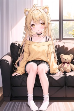 1girl, solo, long hair, looking at viewer, blush, bangs, blonde hair, long sleeves, bow, animal ears, bare shoulders, brown eyes, sitting, collarbone, full body, yellow eyes, braid, ahoge, parted lips, shorts, choker, day, socks, puffy sleeves, indoors, off shoulder, :o, sweater, sleeves past wrists, short shorts, window, single braid, bell, black choker, chair, no shoes, black shorts, stuffed toy, stuffed animal, white socks, couch, teddy bear, wooden floor, on couch, brown sweater, on chair, off-shoulder sweater, armchair, yellow sweater