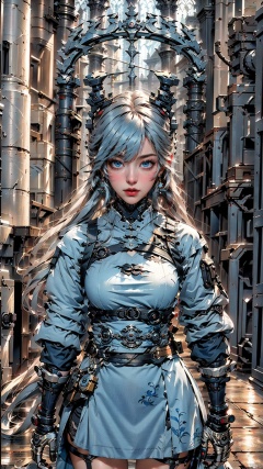 1 girl, solo, (upper body) female focal point, (Hanfu) (kimono) (skirt), blue long hair, (Chinese clothing) (blue eyes) (bright pictures) red lips, bangs, earrings, kimono, Chinese cardigan, print, tassels, (front view) (front view), sword (straight sword)