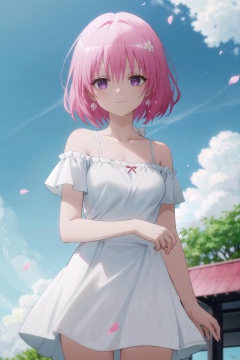 cherry_blossoms,falling_petals,petals,branch,pink_flower,1girl,blue_sky,spring_\(season\),petals_on_liquid,flower,hanami,dress,pink_hair,solo,day,sky,short_hair,outdoors,cloud,bangs,smile,pink_eyes,white_dress,bare_shoulders,earrings,breasts,holding_flower,wind,tree,looking_at_viewer,cowboy shot,