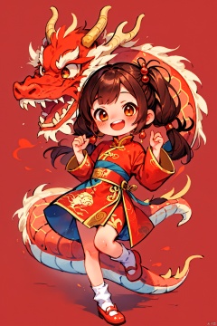 chinese new year,  1girl,  solo,  long hair,  looking at viewer,  blush,  smile,  open mouth,  simple background,  brown hair,  hair ornament,  red eyes,  long sleeves,  dress,  twintails,  brown eyes,  shoes,  teeth,  hand up,  low twintails,  chinese clothes,  red footwear,  red background,  dragon,  eastern dragon,<lora:EMS-266638-EMS:0.800000>