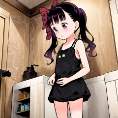 masterpiece, best quality, 1girl, loli,Cocoa,solo, long hair, black hair,bow, twintails, purple eyes, purple hair, hair bow, Bathroom,Take a shower,