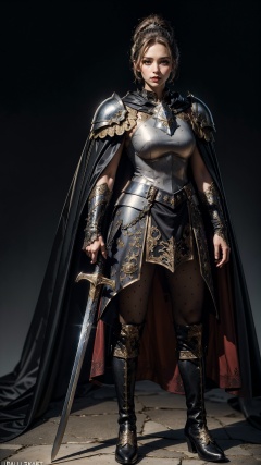 <lora:merged_0022:0.75>,tutututu,pantyhose,(black boots:1.2),serious look pressed lips,(black updo:1.2),(black steel armor:1.1) and robes (cape:1.2) royalty ornate (embroidery:0.5) with sword,skinny (Gorget Plackart pauldron :1.3),(masterpiece:1.2) (illustration:1.1) (best quality:1.2) (detailed) (intricate) (8k) (HDR) (wallpaper) (cinematic lighting) (sharp focus),