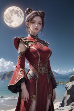 outdoors,(black hairs:1.2),(large breasts:1.0),flowers,floating hair,sky,rainbow,moon,sky,stars,(arms at sides:1.3),standing,mountains,crystal,sea,desert,upper body,1girl, solo, jewelry, hair bun,earrings, double bun, dress, detached sleeves, red dress, brown eyes, brown hair, red hair,wide sleeves, realistic, chinese clotheslooking at viewer,closed mouth,<lora:dingdang-maxiaotao:0.55>