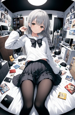 chowbie_jue,bangs,black_bow,black_pantyhose,black_skirt,blurry,blurry_background,bow,braid,brown_eyes,grey_hair,hair_between_eyes,hair_bow,hand_up,highres,legs,long_hair,long_sleeves,looking_at_viewer,original,black background,pantyhose,pleated_skirt,puffy_long_sleeves,puffy_sleeves,sailor_collar,shirt,skirt,solo,standing,white_sailor_collar,white_shirt,solo,messy room,loaded interior,bedroom,(((otaku room))),(computer)wide shot,(lying on back:1.3),Herb Ritts,cowboy shot,fisheye,<lora:FG:1>,