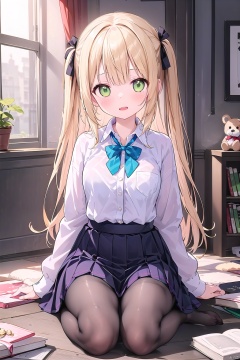 1girl, solo, long hair, breasts, looking at viewer, blush, open mouth, bangs, skirt, blonde hair, shirt, long sleeves, bow, ribbon, sitting, school uniform, green eyes, jacket, hair ribbon, white shirt, pantyhose, pleated skirt, indoors, bowtie, bag, two side up, black jacket, book, black pantyhose, bird, no shoes, eyepatch, stuffed toy, stuffed animal, purple skirt, purple bow, yokozuwari, purple bowtie, cage, fischl \(genshin impact\)