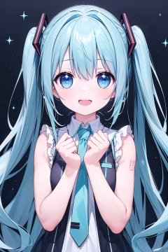 1girl, solo, long hair, looking at viewer, blush, smile, open mouth, bangs, blue eyes, simple background, shirt, hair ornament, white background, hair between eyes, bare shoulders, twintails, very long hair, blue hair, upper body, :d, frills, sleeveless, star \(symbol\), hands up, aqua hair, frilled shirt, starry background, hatsune miku