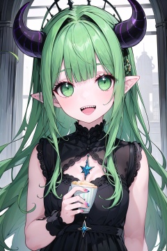 1girl, solo, long hair, looking at viewer, smile, open mouth, bangs, holding, green eyes, :d, food, green hair, horns, teeth, pointy ears, blunt bangs, nail polish, cup, sharp teeth, portrait, curled horns
