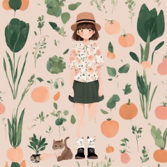 minimalist illustration,official art wallpaper,1boy, black footwear, hat, blush,standing, skirt, brown hair, socks, shirt, floral print, animal, vegetable, shoes, holding vegetable, cat, blush stickers, paw print, bangs, green theme