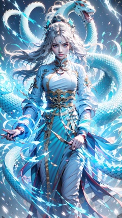 1 Girl, Ancient Chinese Hanfu, White Hair, Sword Holding, Long Sleeve, Dynamic Pose, Ancient Chinese Architecture, Giant White Snake, Energy Storm, Watching Audience, Female Focus, Outdoors, Standing, Snake