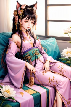 1girl,flowers, jewerly,hanfu, jtc,cat ears,chinese clothes,sitting on couch,indoors,