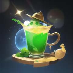 a green liquid in a glass jar with a gold fish on it and a hat on top of it, no_humans, lens_flare, moon, sun, game icon, cartoon style