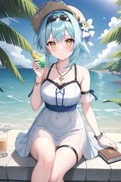 1girl, solo, breasts, looking at viewer, bangs, hat, dress, holding, jewelry, sitting, blue hair, yellow eyes, hairband, food, alternate costume, medium hair, necklace, white dress, bracelet, cup, book, thigh strap, sunglasses, black hairband, sun hat, eyewear removed, holding eyewear, eula \(genshin impact\)