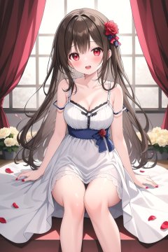 1girl, solo, long hair, breasts, looking at viewer, blush, open mouth, bangs, brown hair, red eyes, dress, holding, cleavage, bare shoulders, medium breasts, collarbone, flower, thighs, lying, teeth, sleeveless, indoors, on back, nail polish, white dress, bare arms, petals, bare legs, window, sleeveless dress, feet out of frame, rose, upper teeth only, curtains, red flower, red nails, strap slip, red rose, stairs, holding flower, rose petals, hair spread out