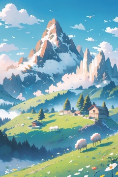 masterpiece,best quality,illustration,outdoors, sky, day, cloud, blue_sky, no_humans, animal, grass, nature, scenery, mountain, landscape, mountainous_horizon, sheep, hill