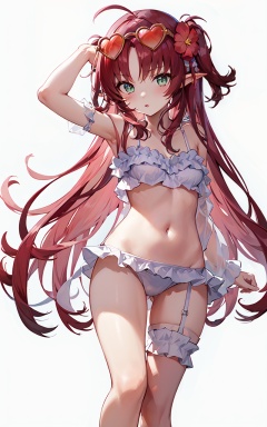 masterpiece, high quality, highres, 1girl, simple background, white background,<lora:myrtleSunflowerArknightsV2-2:0.65>,sunflower, white bikini,frilled bikini, eyewear on head, heart-shaped eyewear, thigh strap, light blush, :q, small breasts, leg up, barefoot, parted lips,pink hair, very long hair, cowboy shot, standing, looking at viewer,