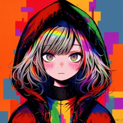 glitchcore, 1girl, solo, upper body, jacket, looking at viewer, hood, bangs, multicolored eyes, closed mouth, blush, turtleneck, black sweater, sweater, medium hair, turtleneck sweater, abstract background, hooded jacket, red eyes, grey hair, hood up, multicolored background, short hair, zipper<lora:glitchcore:0.8>,