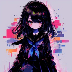 glitchcore,1girl,solo,school uniform,serafuku,black hair,looking at viewer,skirt,black serafuku,black skirt,sailor collar,red eyes,shirt,bangs,black sailor collar,neckerchief,black shirt,long sleeves,abstract,medium hair,hair between eyes,upper body,blue eyes,closed mouth,abstract background,pleated skirt,colorful,blue background,glitch,<lora:glitchcore:0.8>,