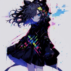 glitchcore, 1girl, solo, black hair, looking at viewer, long sleeves, hair bow, bow, blue eyes, hair ornament, heart, bangs, black bow, jacket, cowboy shot, glitch, medium hair, standing, abstract background, black dress, black jacket, closed mouth, hood, dress<lora:glitchcore:0.9>,