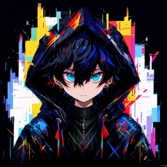 glitchcore, blue eyes, solo, male focus, hood, 1boy, hood up, earrings, black hair, looking at viewer, upper body, jewelry, jacket, hair between eyes, glitch, black jacket, closed mouth, sweater, turtleneck, short hair, black sweater, black background, hooded jacket, open jacket, bangs, turtleneck sweater