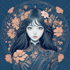 masterpiece, best quality, 1girl, flowers, flat color, lineart, abstract, ornate, blue theme