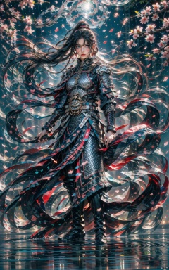 1 Girl, Blue Eyes, Pink Long Hair, Pink Armor, Chinese Armor, Pink Shawl, Athletic Pose, Night, Outdoors, Web Digital Lighting, Neon Lights, Web Colors, Cherry Blossoms, Petals, Reflective Floor, Splash, Ripples., Daofa Rune
