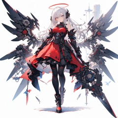 robot girl, 1girl, solo, halo, long hair, wings, weapon, sword, breasts, armor, full body, looking at viewer, dress, holding, red dress, mechanical wings, bangs, bare shoulders, sheath, red gloves, holding sword, holding weapon, grey eyes, gauntlets, boots, pantyhose, white hair, standing, white background, hair between eyes, gloves, closed mouth, head tilt, medium breasts