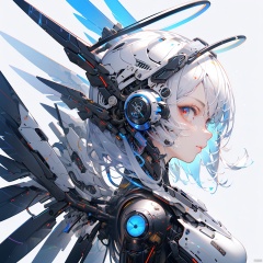 robot girl, 1girl, solo, red eyes, breasts, white hair, halo, from side, white background, upper body, wings, mechanical wings, looking at viewer, mecha musume, profile, simple background, long hair, medium breasts, bangs, android, closed mouth, large breasts