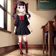 masterpiece, best quality, 1girl, loli,Cocoa,solo, long hair, black hair,bow, twintails, purple eyes, purple hair, hair bow, School uniform,full body,