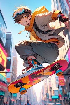 (\a suo\), skateboard, 1boy, male focus, smile, gloves, solo, goggles, sneakers, fingerless gloves, goggles on head, jacket, outdoors, grin, looking at viewer, pants, sky, short hair, roller skates, skates, shoes, black gloves, building, yellow eyes, day, orange eyes, inline skates, midair, city, hood, brown hair