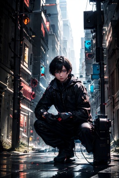 solo, looking at viewer, short hair, blue eyes, black hair, gloves, 1boy, holding, hair between eyes, sitting, jacket, male focus, outdoors, black gloves, pants, black jacket, black pants, squatting, ground vehicle, building, motor vehicle, zipper, reflection, city, camera, holding camera