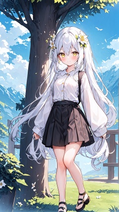 1girl, solo, long hair, breasts, looking at viewer, blush, smile, bangs, skirt, shirt, hair ornament, long sleeves, hair between eyes, very long hair, closed mouth, standing, full body, yellow eyes, white shirt, flower, white hair, pleated skirt, outdoors, sky, day, puffy sleeves, collared shirt, cloud, hair flower, black skirt, bag, black footwear, tree, blue sky, sleeves past wrists, bare legs, bird, sandals, cloudy sky, grass, white flower, puffy long sleeves, shoulder bag, mountain