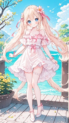 1girl, solo, long hair, looking at viewer, blush, smile, bangs, blue eyes, blonde hair, dress, ribbon, bare shoulders, very long hair, closed mouth, standing, full body, hair ribbon, braid, flower, outdoors, frills, sky, day, off shoulder, white dress, high heels, tree, blue sky, wrist cuffs, white footwear, frilled dress, white ribbon, pink flower, stairs, off-shoulder dress