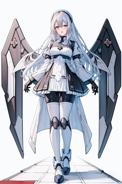 1 girl, solo, gradual change of color Mecha pants, wings, long hair, white shoes, hair accessories, looking at the audience, white hair, hair accessories, bangs, blue eyes, staff, clean background, mechanical wings, gloves, simple background, cute, graphics card propaganda figure, console, (gradual change of color cheongsam), festive, (Mondrian color matching :1.5), ancient Chinese architecture,,<lora:天启姬:0.7>,