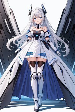 1girl,bare shoulders,boots,breasts,dress,elbow gloves,eyebrows visible through hair,gloves,looking at viewer,machinery,mecha musume,mechanical wings,simple background,smile,solo,standing,strapless dress,thighhighs,white background,white dress,white legwear,wings,<lora:天启姬:0.6>,