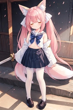 (masterpiece:1.1), (best quality:1.2), highres, original, extremely detailed wallpaper, 1girl, solo, (half-closed eyes), loli, school uniform, collared shirt, pleated skirt, unbuttoned,shy, hair bow, bowtie, very long hair, sitting, full body, pink hair, yellow eyes, animal ears, twintails, (fox ears, fox Tail), hair ornament,white pantyhose, yellow bow, braid, bare shoulders, white pantyhose, platform footwear,weapon, Samurai Sword, serafuku, loafers, white thighhighs, ray tracing, tamamo