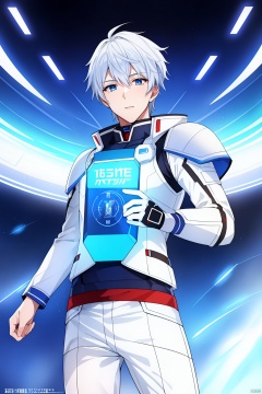 1 boy, blue eyes, white hair, red space suit, (bust: 1.3), dynamic pose, HD, 32k, (Masterpiece: 1.5), magazine cover