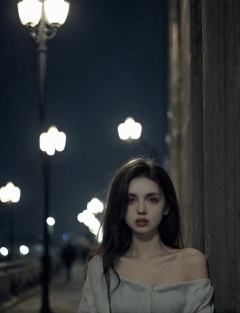 solo,realistic,lips,black hair,collarbone,closed mouth,Beside the outdoor street,the dim light of the street lamps at night shines on one side of the face,1girl,absurdres,(Looking at the camera:1.2),<lora:东方审美_ BRairt.SDXL_v1.0:0.6>,<lora:ChillyV1.0-000010:0.8>,