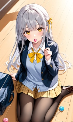 (masterpiece), (best quality),1girl, solo, lollipop, pantyhose, skirt, long hair, candy, food, jacket, school uniform, shoes, sitting, black pantyhose, looking at viewer, breasts, blazer, pleated skirt, ribbon, holding, shirt, wariza, holding lollipop, open clothes, very long hair, medium breasts, bag, uwabaki, open jacket, holding candy, yellow skirt, yellow eyes, blush, yellow ribbon, white shirt, school bag, on floor, holding food, bangs, one side up, long sleeves, arm support, artist name, black jacket, from above, brown eyes, plaid skirt, collared shirt, grey hair, wooden floor, open mouth, hair ornament, plaid, parted lips, leaf, neck ribbon, sweater vest, miniskirt, school briefcase