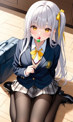 (masterpiece), (best quality),1girl, solo, lollipop, pantyhose, skirt, long hair, candy, food, jacket, school uniform, shoes, sitting, black pantyhose, looking at viewer, breasts, blazer, pleated skirt, ribbon, holding, shirt, wariza, holding lollipop, open clothes, very long hair, medium breasts, bag, uwabaki, open jacket, holding candy, yellow skirt, yellow eyes, blush, yellow ribbon, white shirt, school bag, on floor, holding food, bangs, one side up, long sleeves, arm support, artist name, black jacket, from above, brown eyes, plaid skirt, collared shirt, grey hair, wooden floor, open mouth, hair ornament, plaid, parted lips, leaf, neck ribbon, sweater vest, miniskirt, school briefcase