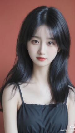 masterpiece, best quality, high_res, (Realistic:1.5), 1girl,wavy hair, zhen,tight black camisole ,red background