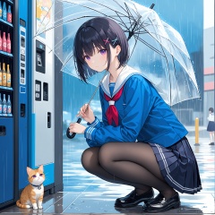 (masterpiece), (best quality), 1girl, transparent, school uniform, rain, umbrella, cat, hair ornament, pantyhose, squatting, skirt, transparent umbrella, serafuku, holding, short hair, solo, purple eyes, black footwear, white sailor collar, outdoors, loafers, shoes, hairclip, sailor collar, x hair ornament, long sleeves, neckerchief, black hair, pleated skirt, bangs, holding umbrella, blue shirt, animal, shirt, blue serafuku, closed mouth, hair between eyes, black pantyhose, vending machine, blue skirt, black skirt
