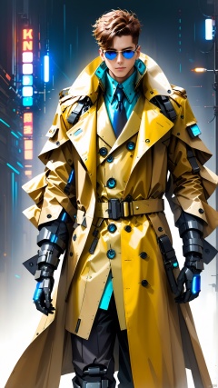 A stylish futuristic man wearing a distinctive mechanical trench coat with a simple background